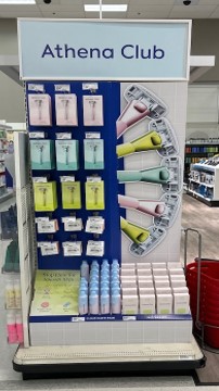 Athena Club highlights their product with visually appealing colors and larger-than-life imagery. This display emphasizes inviting product visuals to catch the eye of the consumer.