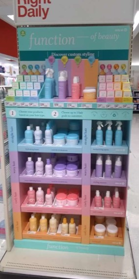 Function of Beauty uses a soft and dreamy, on-trend ombre color palette to catch shoppers’ attention. This specific product requires customers to purchase multiple items to match their hair type. The display uses perfect placement to ensure products are kept in the correct order and easily step customers through the purchase process.