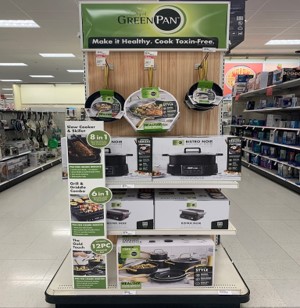 GreenPan’s display uses their identifiable green color to call attention to their brand, which was a well-known Direct to Consumer brand prior to entering retailers. They used their endcap space to identify each of their pan sets and uses, making it an educational and creating a value statement.