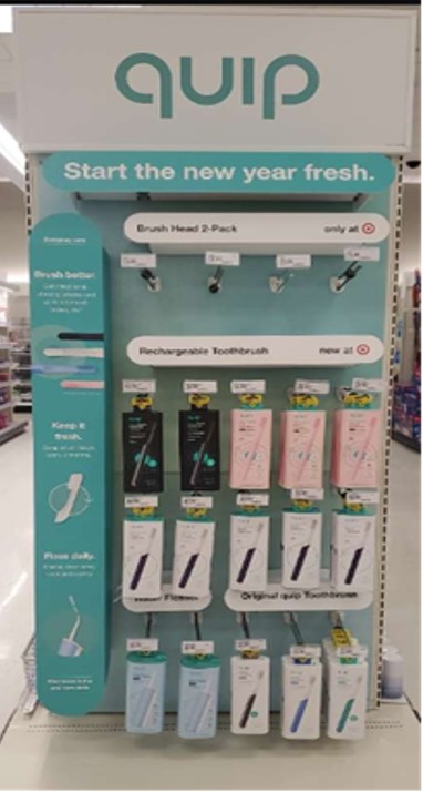 Quip uses their endcap space for storytelling. It allows them to express what makes their product unique. Endcap displays allow brands to provide key selling points and short copy much like an online experience.